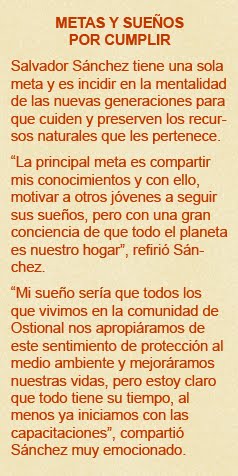 Salvador es el menor de diez hermanos. No culminó sus estudios de ingeniería mecánica por diversas circunstancias, sin embargo, ya estaba en su conciencia la búsqueda del conocimiento.Fue gracias a mi hermano, José María Sánchez, que me motivé para organizar a las personas. Él llegó a ser diputado, y al descubrir los mecanismo y procedimientos de la política, sentí que podía trabajar por la gente desde mi comunidad”, compartió Sánchez.NACE UN LIDER AMBIENTALISTAEn 1996 Salvador Sánchez comenzó su verdadera preocupación por la vida de las tortugas marinas. “Yo veía cómo saqueaban los huevos de tortugas. No le encontraba lógica a lo que pasaba a mi alrededor, por que yo nunca necesite de sacar un huevo de tortuga para sobrevivir, entonces ¿por qué los demás lo hacían? ”, se cuestionó en su momento Salvador.Justo en ese año comienza a indagar sobre las leyes ambientales. Así pues, apoyado por su hermano el diputado, inicia su carrera como líder enfocando sus planes de acción en los temas ambientales como el de proteger a las tortugas marinas, erradicar la basura de las calles, evitar la tala de los árboles, y la contaminación de las playas.Había una necesidad latente en mí de trabajar en estos temas, pero es hasta hace un año que me encontré con un organismo no gubernamental llamado Paso Pacífico que logré aterrizar algunos proyectos”, explicó Sánchez.CAPACITACIÓN: INVERSIÓN SEGURA PARA EL FUTUROSalvador Sánchez se preocupó por aprender las herramientas básicas que le llevarían ha ganarse el respeto de su comunidad, por lo que participó en seminarios como: Resolución de conflictos entre comunitarios, así como el manejo de Cuencas Críticas y el Manto Acuífero de Nicaragua.Para mí la capacitación es muy importante, porque eso me permite conocer y comprender muchos temas que antes no conocía, ahora veo y valoro mucho más lo que tenemos los nicaragüenses”, explicó Sánchez.Confesó que recientemente recibió un seminario sobre Áreas protegidas y que compartió experiencias con guarda recursos de Nicaragua y Costa Rica.Este proyecto fue financiado por Paso Pacífico gracias al apoyo que recibe de agencias extranjeras como USAID. Esto a su vez, me ha abierto puertas, pero también a los jóvenes emprendedores de Ostional, por que aquí se hacen replicas de esos conocimientos”, explicó Sánchez.Actualmente, Salvador Sánchez dirige el equipo de guarda recursos de Paso Pacífico de la zona de Ostional. A su cargo está, apoyar e implementar los programas de reforestación, protección y preservación de los recursos naturales de la vertiente del Pacífico de Nicaragua.Dentro de mis funciones se encuentra la de continuar con el programa de incentivos a los guarda recursos, educación ambiental y reforestación”, explicó el líder comunitario.Sánchez opinó que la capacitación es la mejor forma de hacer conciencia en los niños y jóvenes “pues en los viejos, es difícil hacerlos cambiar de actitud, pero los jóvenes en ellos aún hay tiempo”, finalizó.PEQUEÑO EMPRESARIO TURÍSTICOParalelo a su vida como conservacionista, Salvador Sánchez junto a su esposa Carolina y el pequeño Diego, se esfuerzan por brindar servicios de alimentación y hospedaje a los turistas que llegan a Ostional.Antes de trabajar con Paso Pacífico, logré construir dos cabañas pequeñas cerca del mar, donde ofrecemos los servicios de alimentación, así como paquetes de excursiones por la zona. Hacemos giras de buceo, cayak y avistamientos de aves”, explicó Sánchez.Desde su posición como líder comunitario, Salvador ha logrado demostrar que el cuido del medio ambiente es mucho más rentable cuando se aprovechan soteniblemente los recursos naturales.Aún nos falta mucho por aprender. El tema del turismo sostenible esta siendo una realidad gracias a Paso Pacífico, y me siento orgulloso de pertenecer a este organismo, porque con mi ejemplo muchos otros entenderán la necesidad de cambiar de mentalidad”, comentó el pequeño empresario.